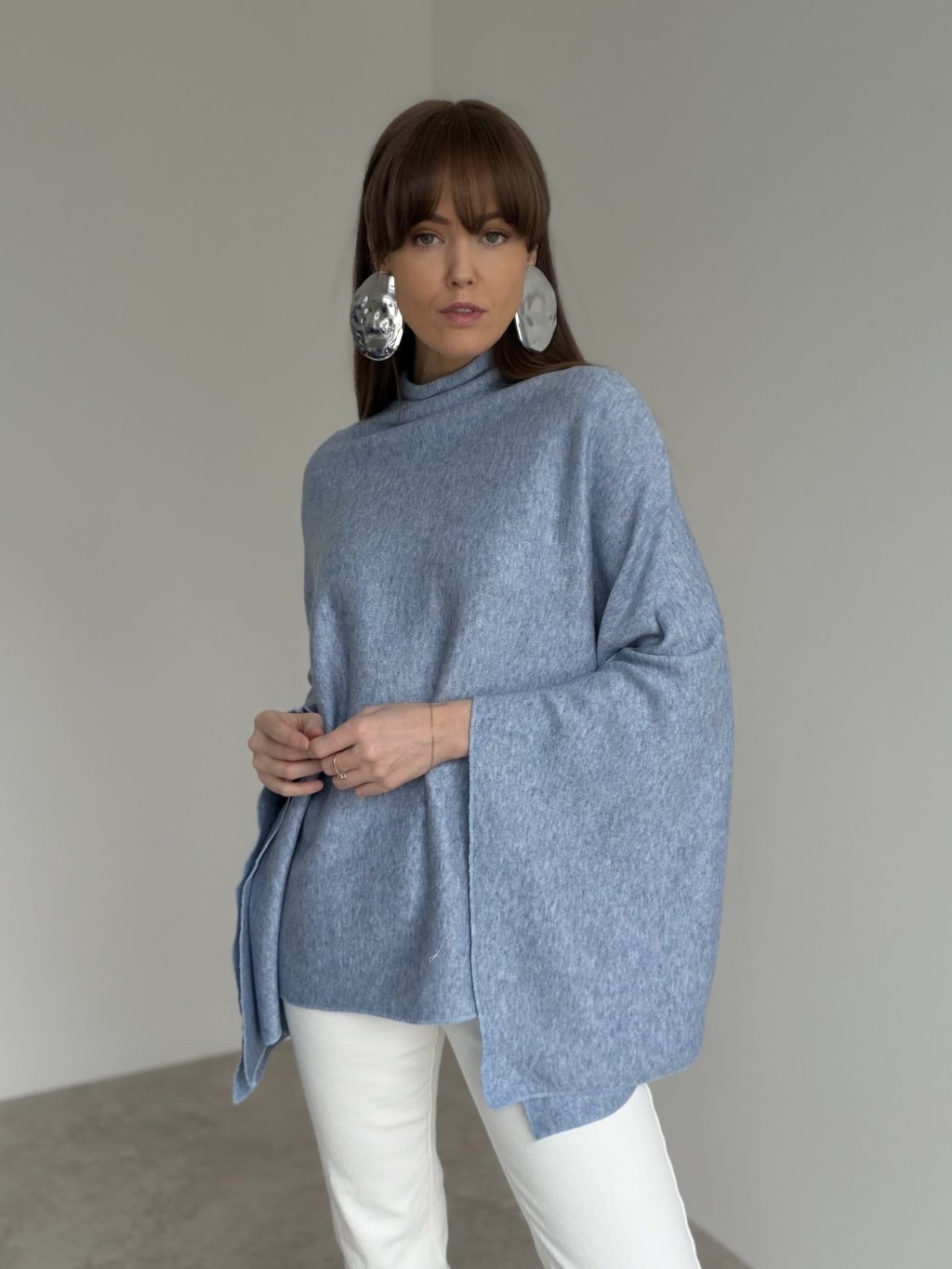 Splývavé úpletové pončo s vyšším golierom a pohodlným voľným strihom, ideálne na vrstvenie.