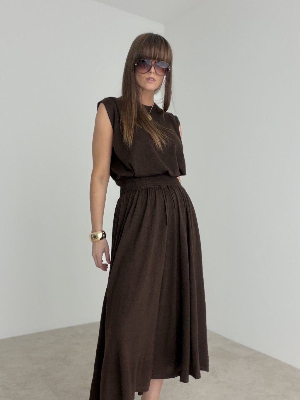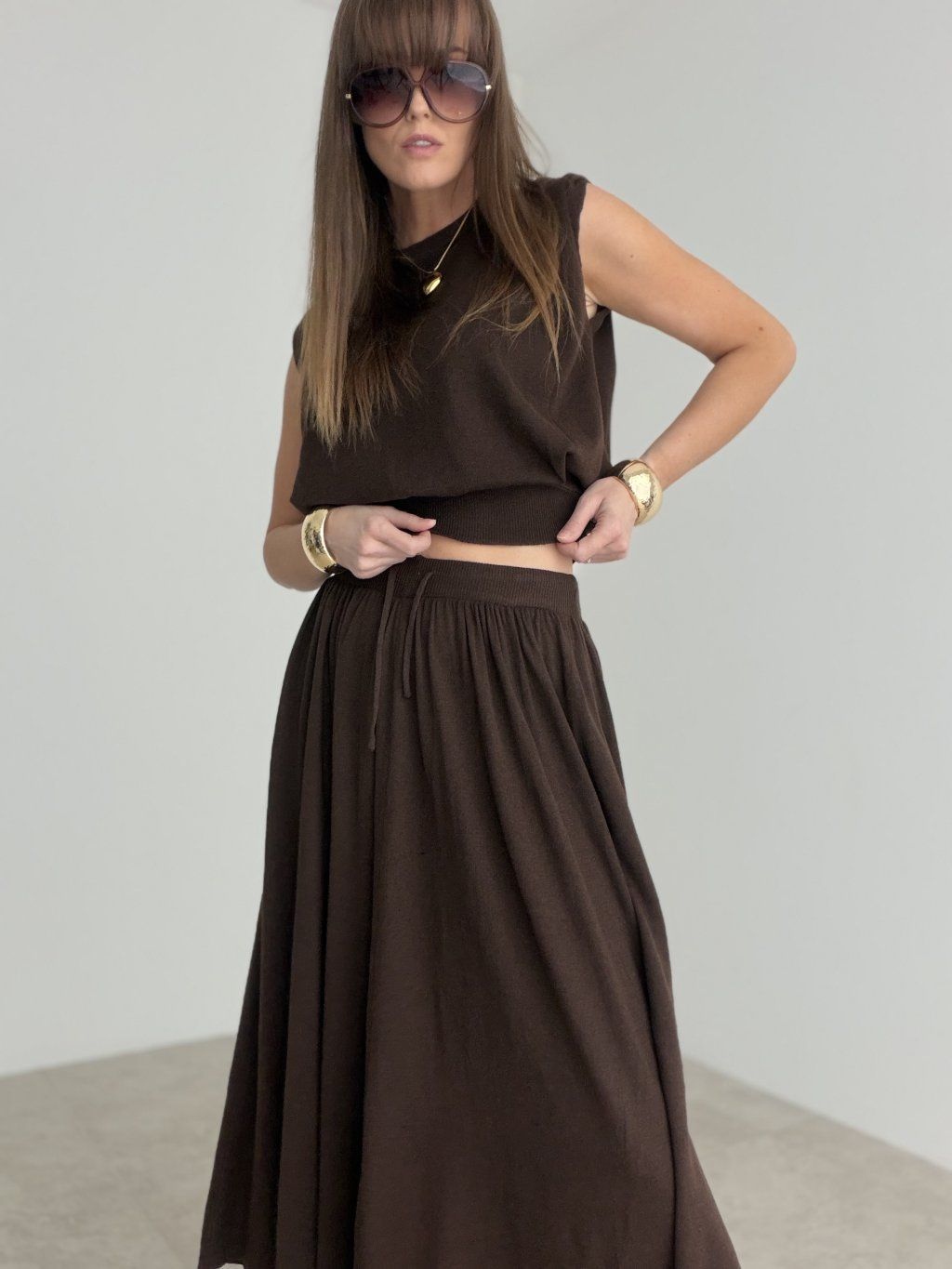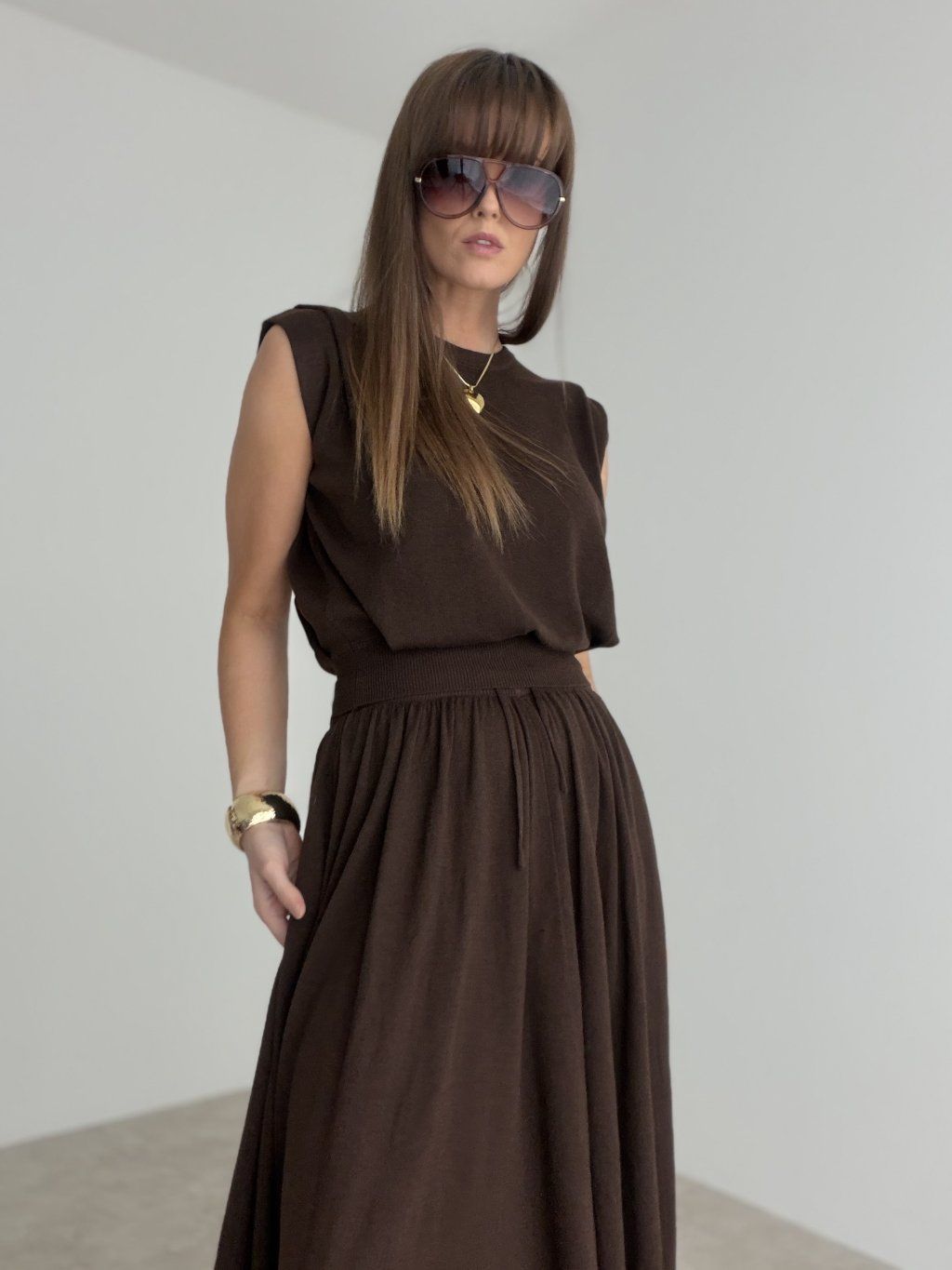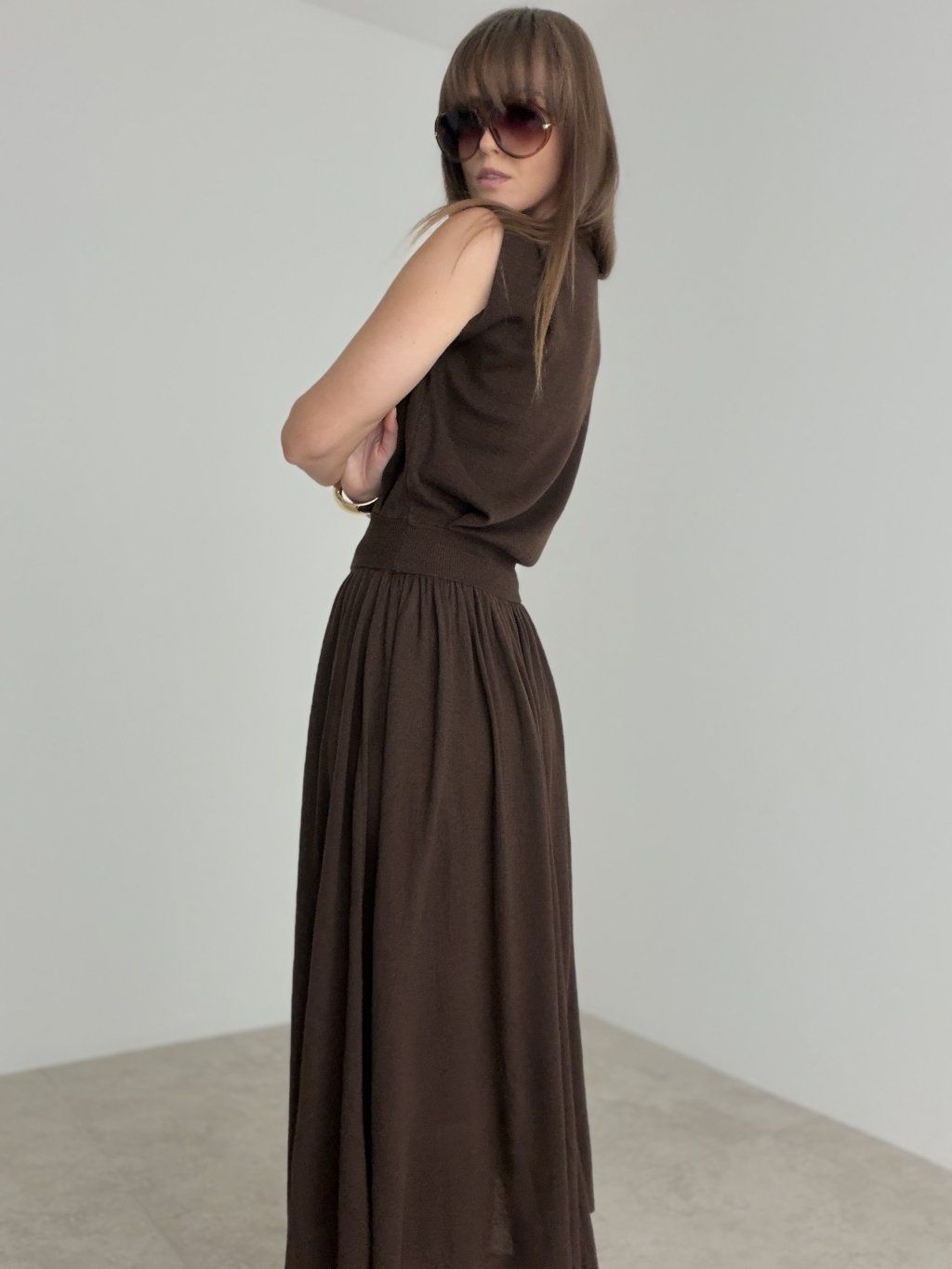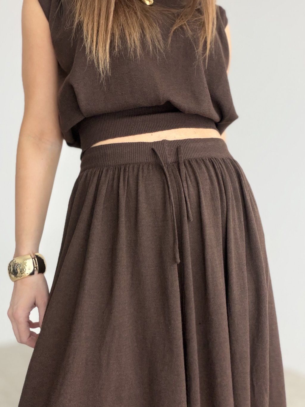 Elegantný komplet je stvorený pre ženy, ktoré milujú pohodlie, ženskosť a zároveň upravený vzhľad bez zbytočného premýšľania nad stylingom. Vrchný diel má jemne minimalistický strih, ktorý pôsobí moderne a čisto, zatiaľ čo spodný diel krásne splýva a pri pohybe vytvára veľmi efektný, ladný dojem. Spolu tvoria harmonický celok, ktorý pôsobí sofistikovane, nadčasovo a veľmi vkusne.