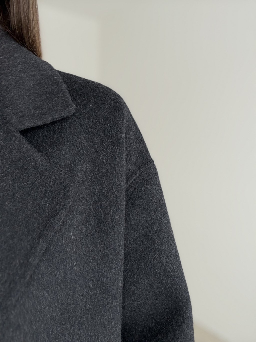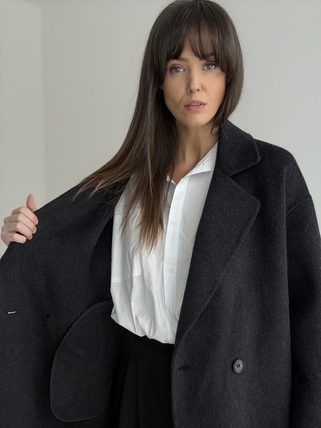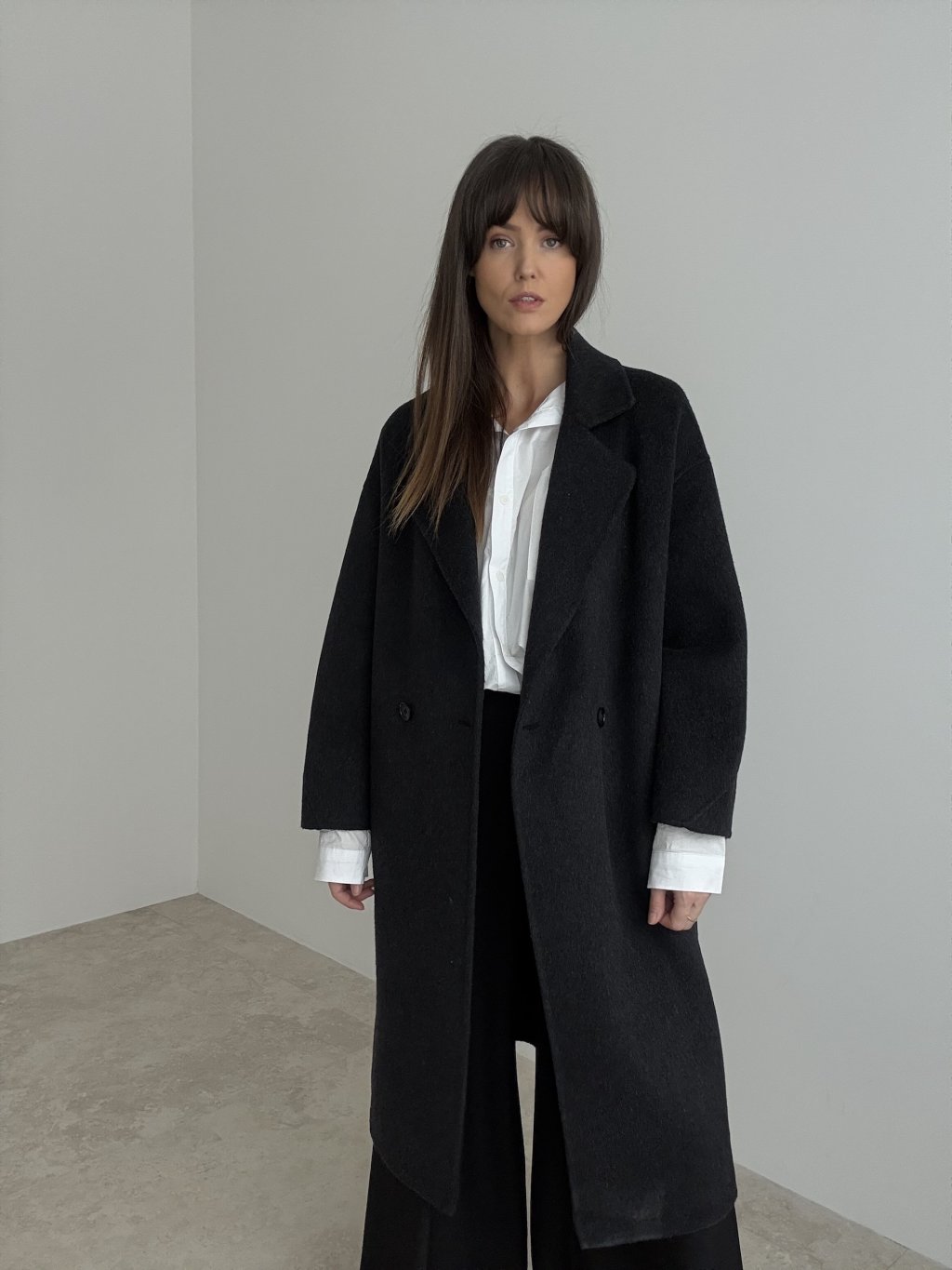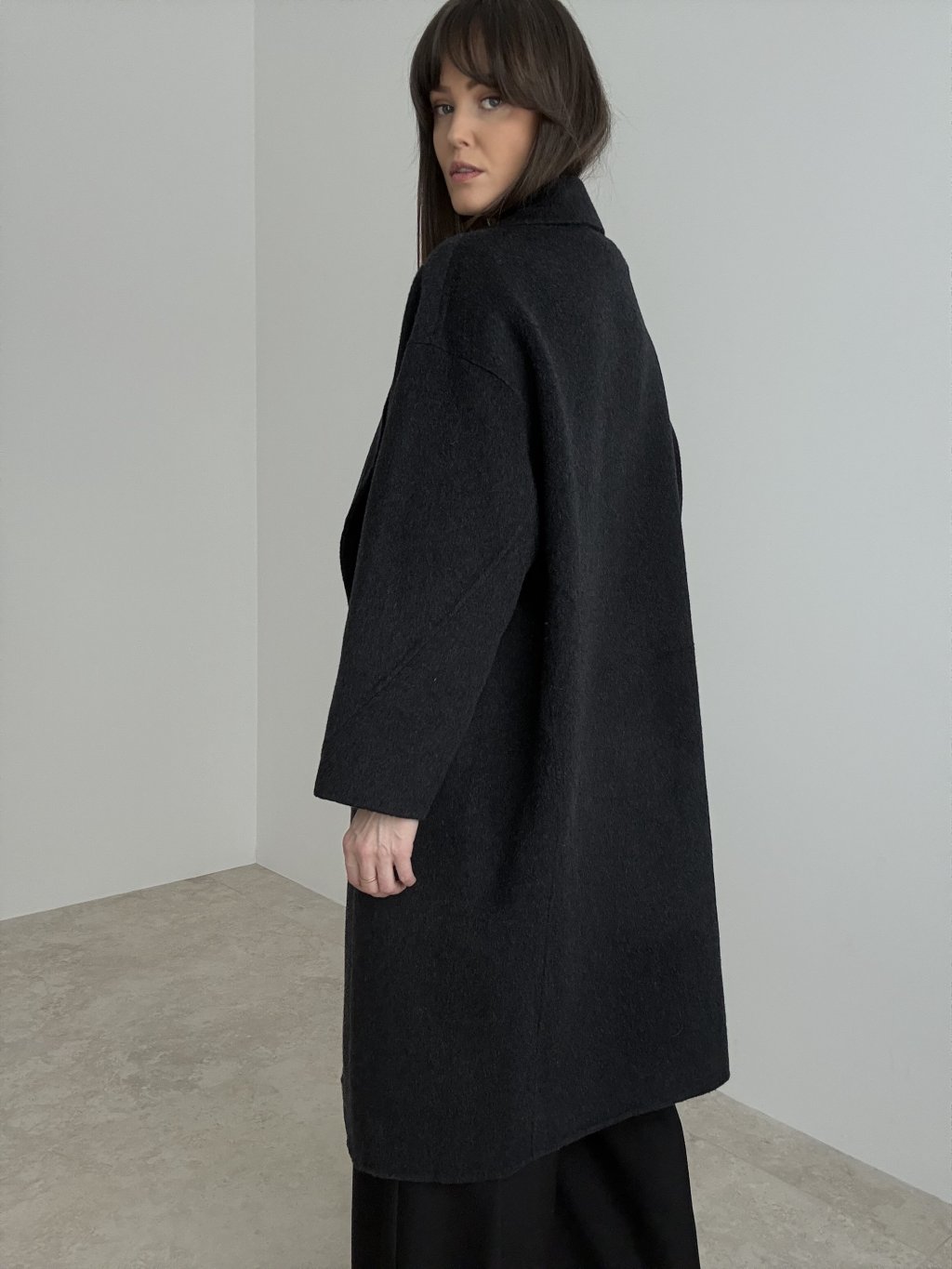 Ručne vyhotovený vlnený kabát s dlhším, voľnejším strihom a klasickými klopami pre nadčasový elegantný vzhľad.