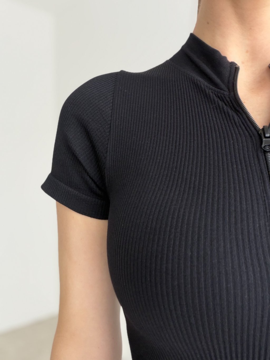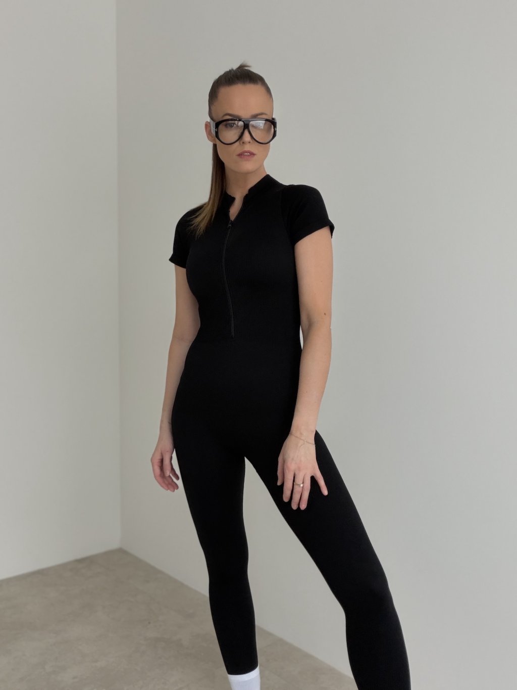 Vrúbkovaný overal s priliehavým strihom, krátkymi rukávmi a zipsom vpredu. Pohodlný, pružný a ľahko kombinovateľný na každý deň aj na štýlové mestské outfity.