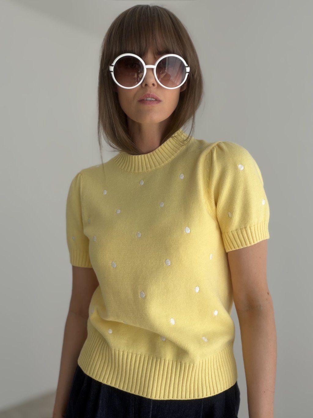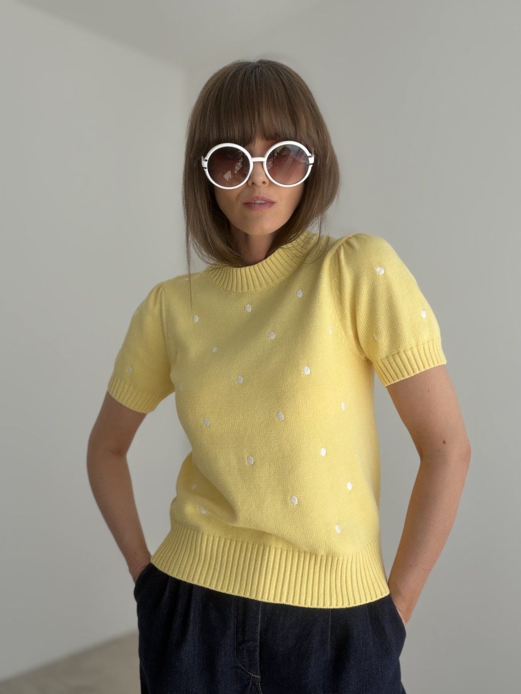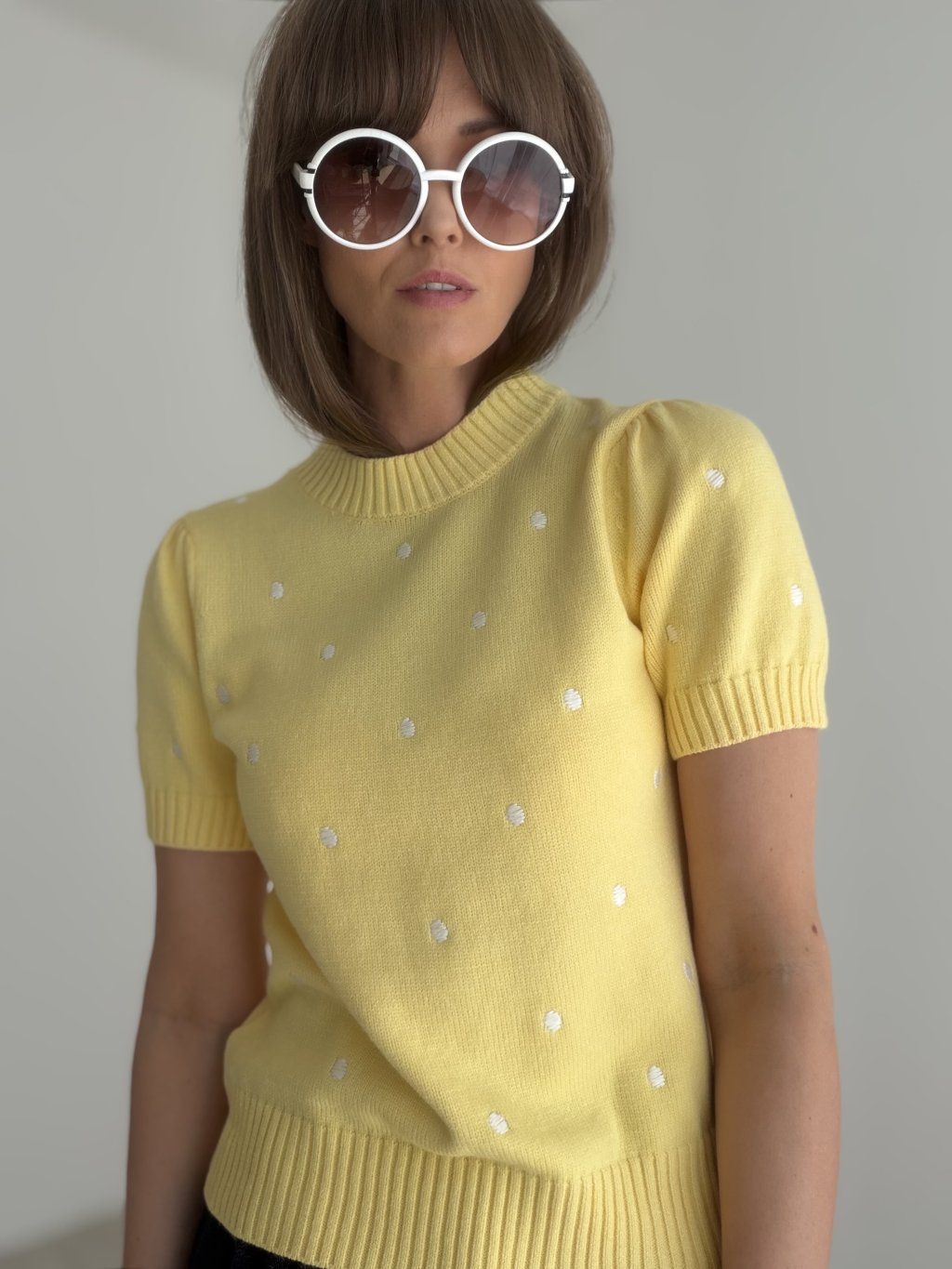 Vyšívaný pulóver s krátkymi rukávmi, okrúhlym výstrihom a jemným pleteným prevedením. Štýlový a ženský kúsok na každodenné nosenie.