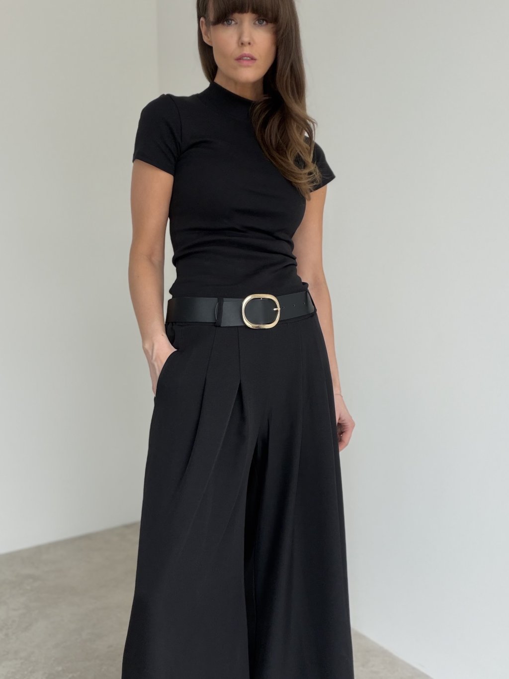 Elegantné nohavice so širokými nohavicami, ktoré krásne predĺžia postavu a pôsobia veľmi upravene. Strih je navrhnutý tak, aby zvýraznil pás a zároveň poskytol komfort počas celého dňa. Predná časť je doplnená o decentné záhyby, vďaka ktorým nohavice pôsobia luxusne a zároveň sa pekne ukladajú pri chôdzi. Praktické vrecká a pohodlné nosenie z nich robia skvelý kúsok do práce, na stretnutia aj na večer – stačí zmeniť top a doplnky.