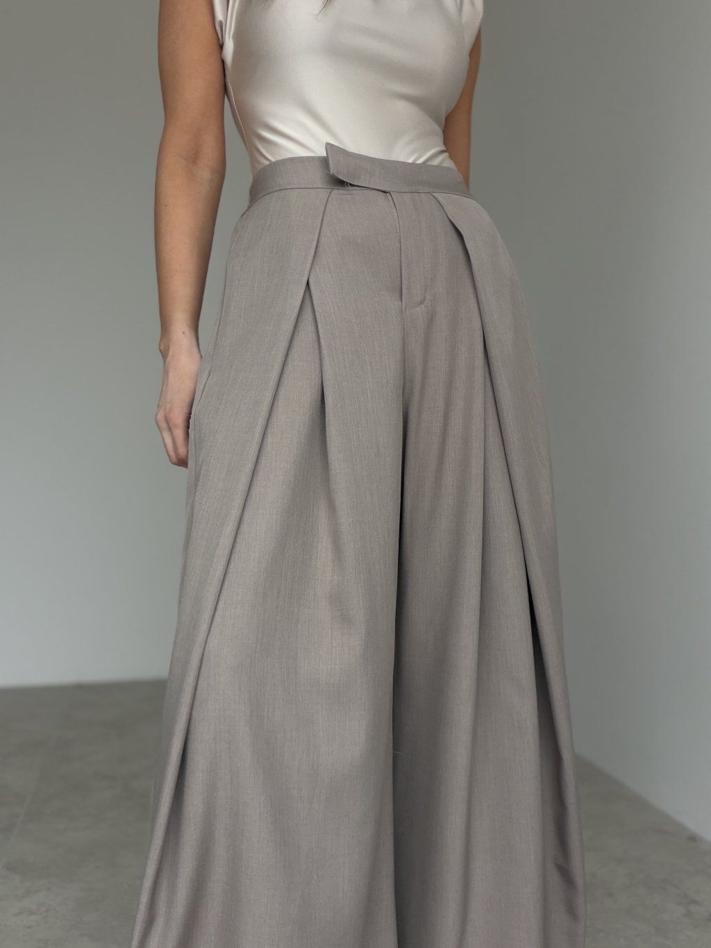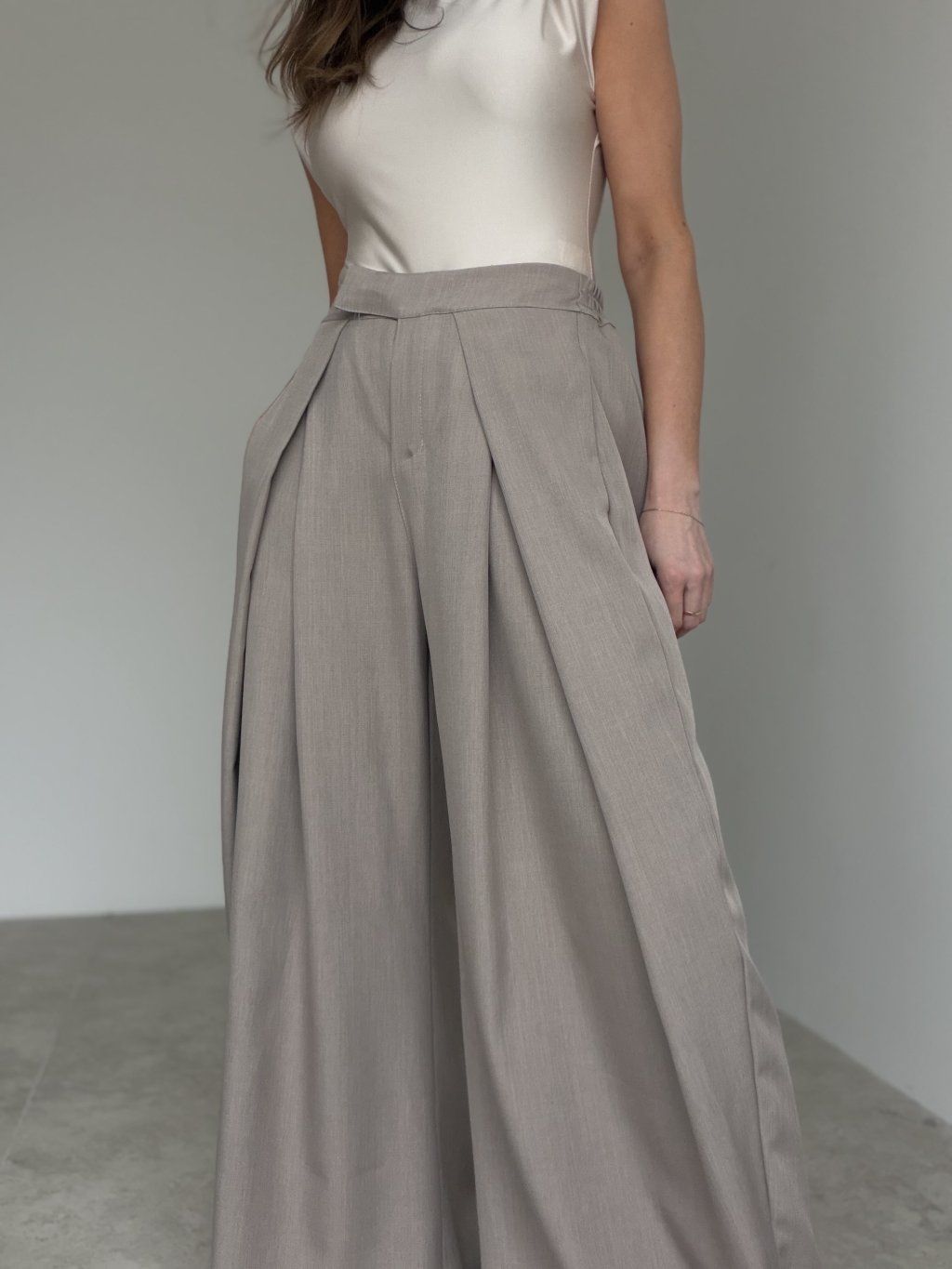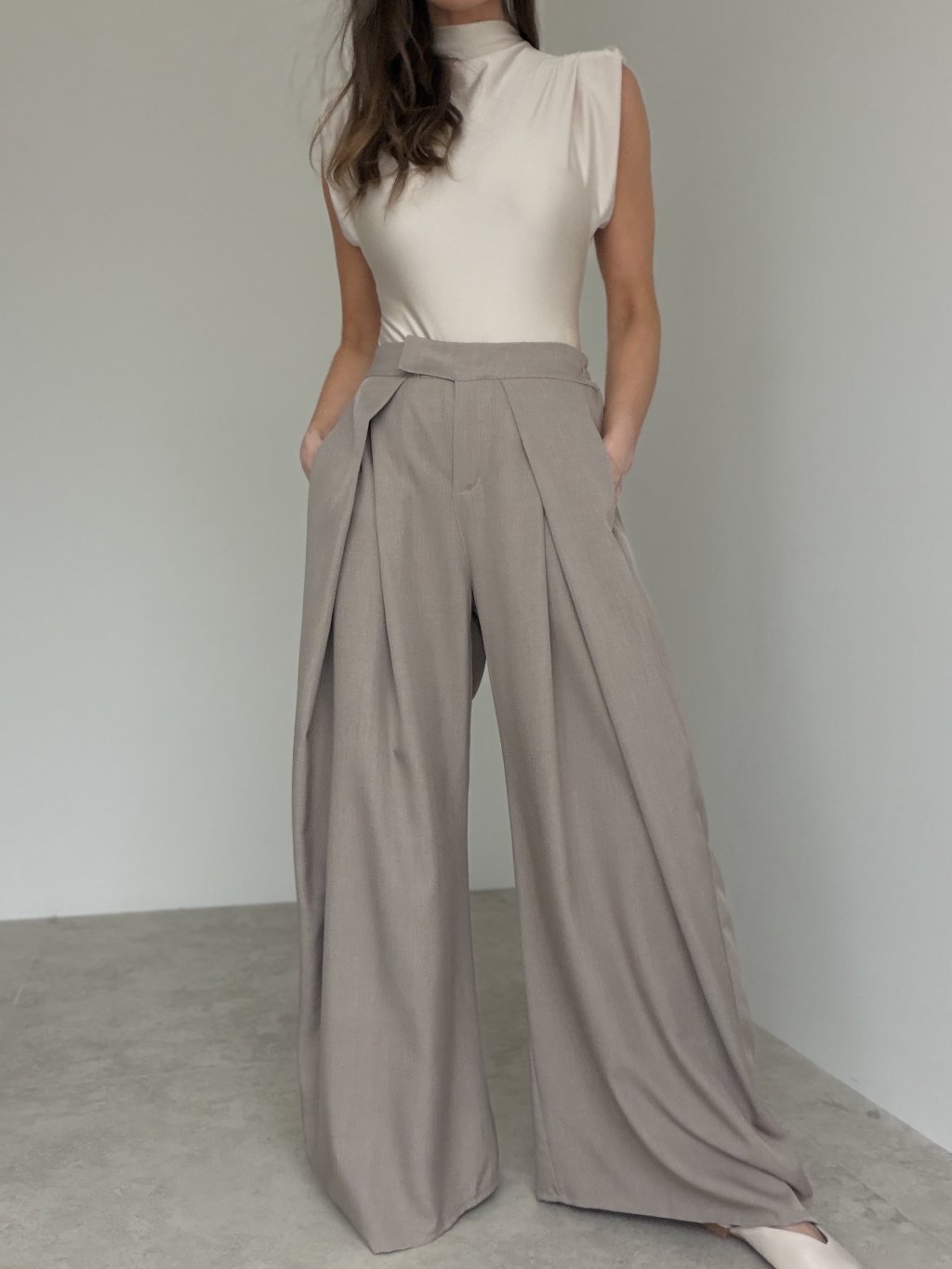 Elegantné široké nohavice s vysokým pásom, ktoré pôsobia upravene a zároveň sú maximálne pohodlné na celodenné nosenie. Predná časť so záhybmi vytvára krásnu siluetu a dodáva outfitu štruktúru, zatiaľ čo zadná časť pásu je riešená pružne, aby sa nohavice príjemne prispôsobili postave. Voľné, široké nohavice splývajú pri chôdzi, opticky predlžujú nohy a ľahko sa kombinujú do pracovných aj voľnočasových outfitov. Stačí zmeniť top a obuv a získaš úplne iný štýl – od minimalistického po elegantný.