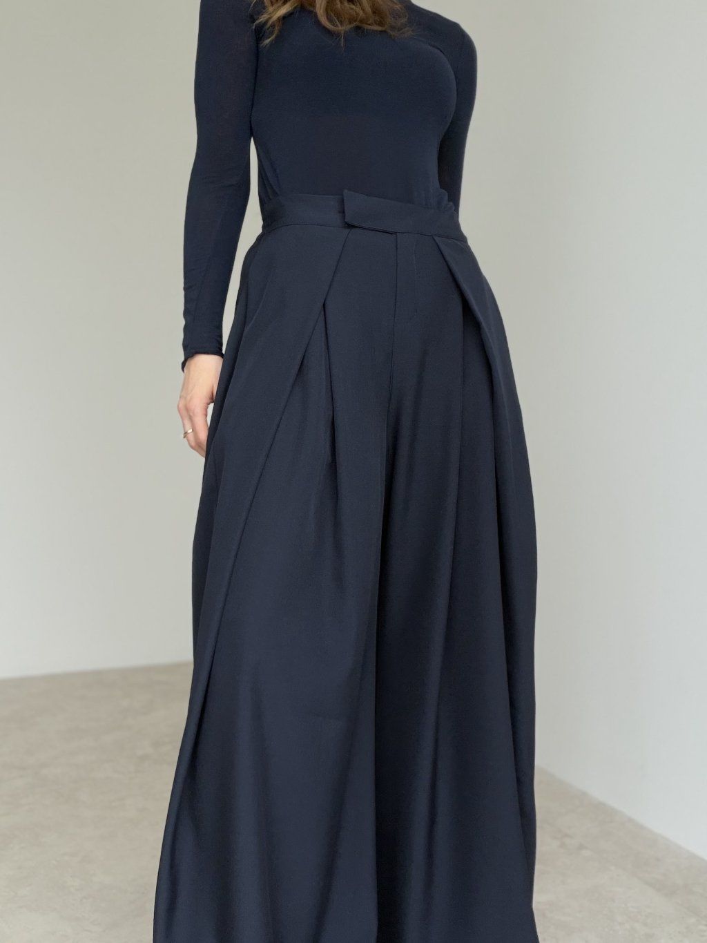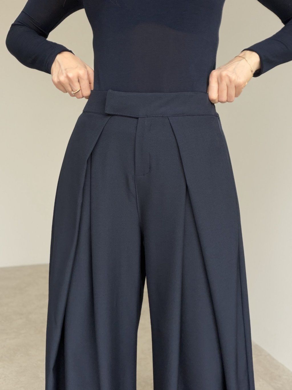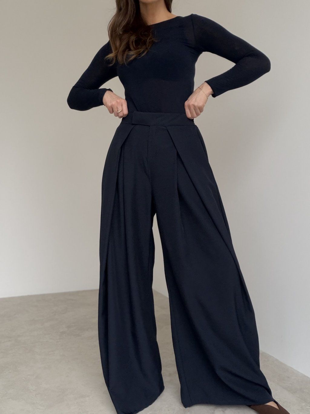 Elegantné široké nohavice s vysokým pásom, ktoré pôsobia upravene a zároveň sú maximálne pohodlné na celodenné nosenie. Predná časť so záhybmi vytvára krásnu siluetu a dodáva outfitu štruktúru, zatiaľ čo zadná časť pásu je riešená pružne, aby sa nohavice príjemne prispôsobili postave. Voľné, široké nohavice splývajú pri chôdzi, opticky predlžujú nohy a ľahko sa kombinujú do pracovných aj voľnočasových outfitov. Stačí zmeniť top a obuv a získaš úplne iný štýl – od minimalistického po elegantný.