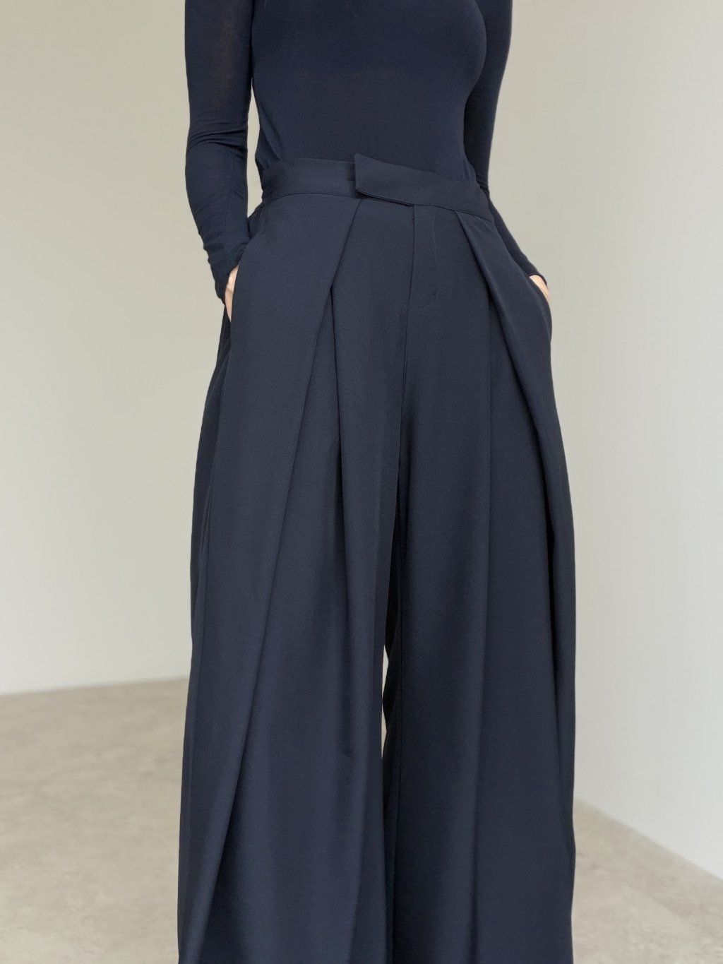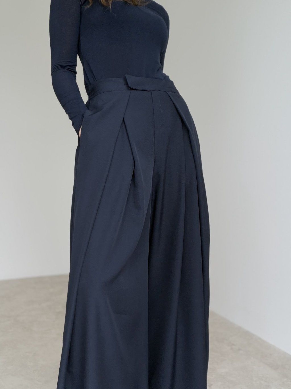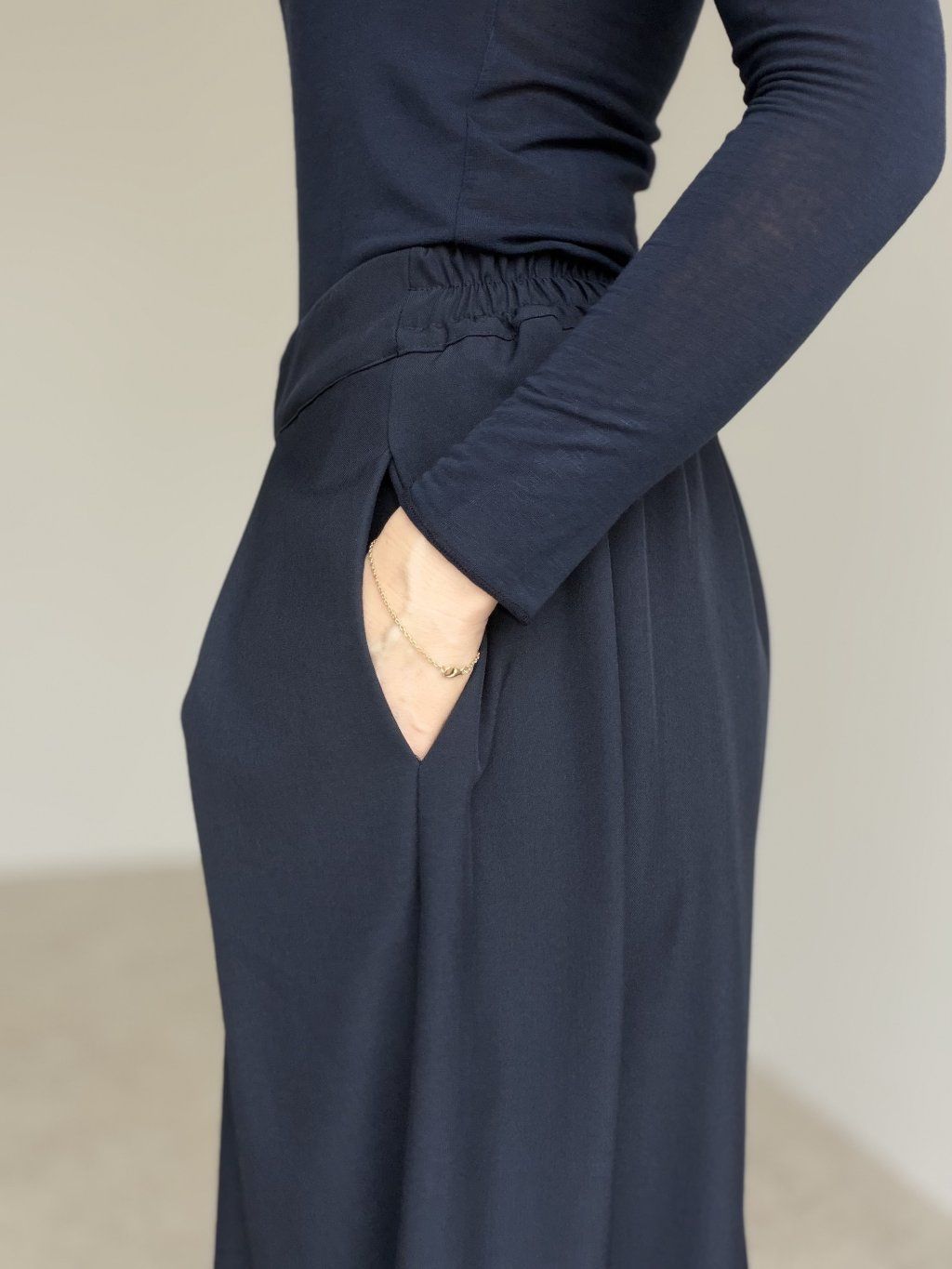 Elegantné široké nohavice s vysokým pásom, ktoré pôsobia upravene a zároveň sú maximálne pohodlné na celodenné nosenie. Predná časť so záhybmi vytvára krásnu siluetu a dodáva outfitu štruktúru, zatiaľ čo zadná časť pásu je riešená pružne, aby sa nohavice príjemne prispôsobili postave. Voľné, široké nohavice splývajú pri chôdzi, opticky predlžujú nohy a ľahko sa kombinujú do pracovných aj voľnočasových outfitov. Stačí zmeniť top a obuv a získaš úplne iný štýl – od minimalistického po elegantný.