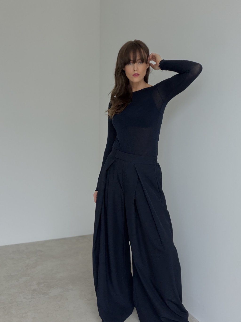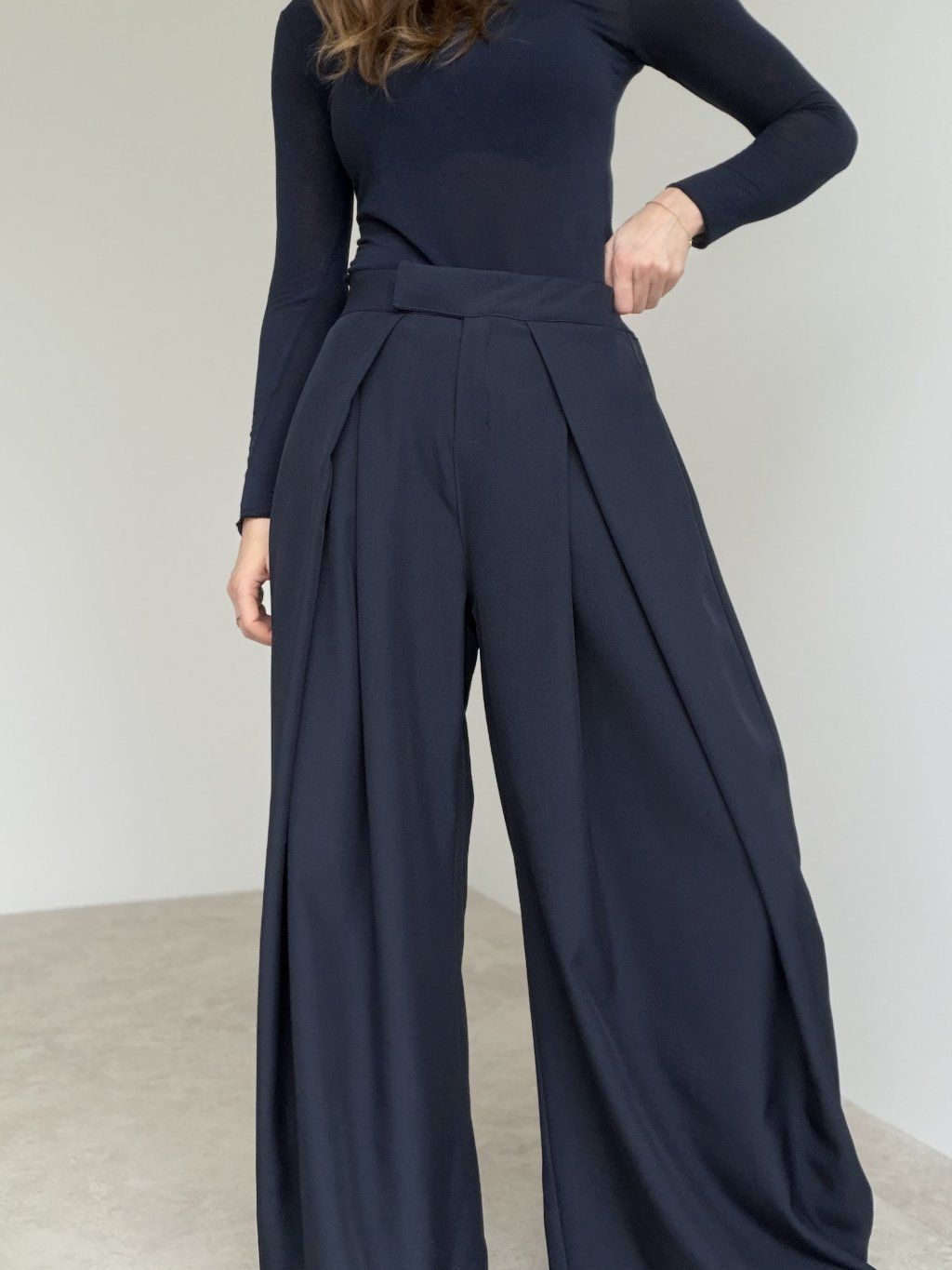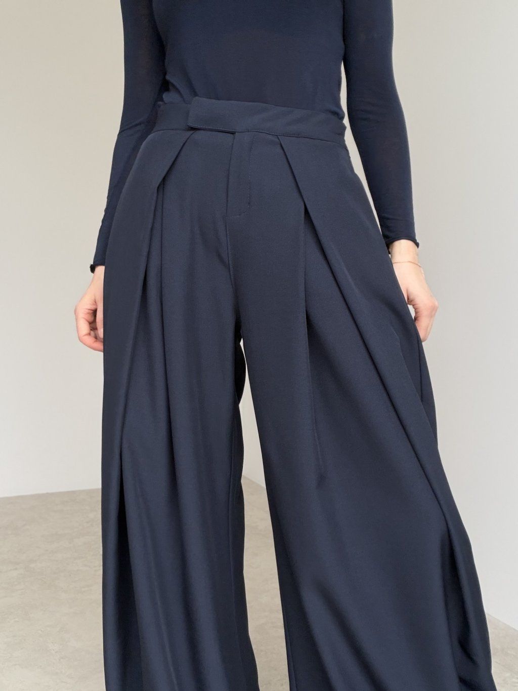Široké nohavice s vysokým pásom, záhybmi vpredu a pružným pásom vzadu. Pohodlný, elegantný strih na každý deň aj do práce.