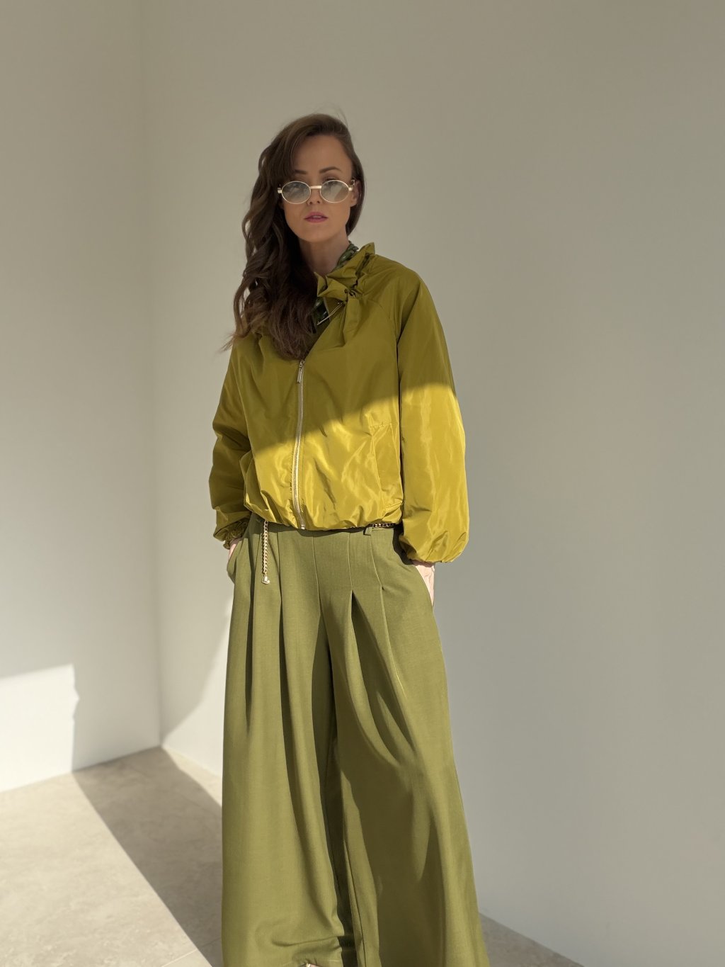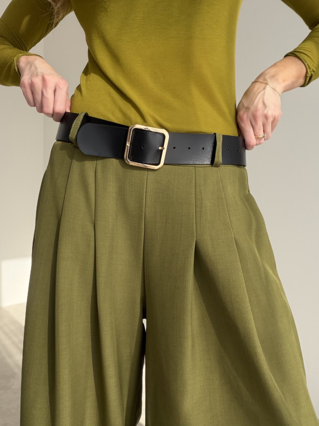 Elegantné nohavice so širokými nohavicami, ktoré krásne predĺžia postavu a pôsobia veľmi upravene. Strih je navrhnutý tak, aby zvýraznil pás a zároveň poskytol komfort počas celého dňa. Predná časť je doplnená o decentné záhyby, vďaka ktorým nohavice pôsobia luxusne a zároveň sa pekne ukladajú pri chôdzi. Praktické vrecká a pohodlné nosenie z nich robia skvelý kúsok do práce, na stretnutia aj na večer – stačí zmeniť top a doplnky.