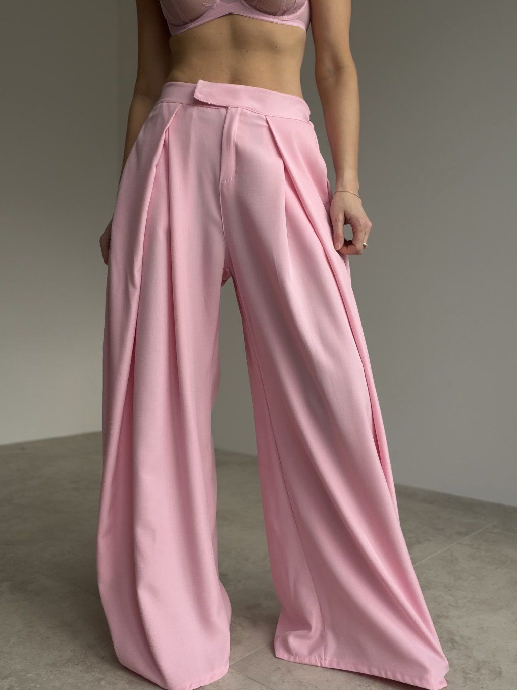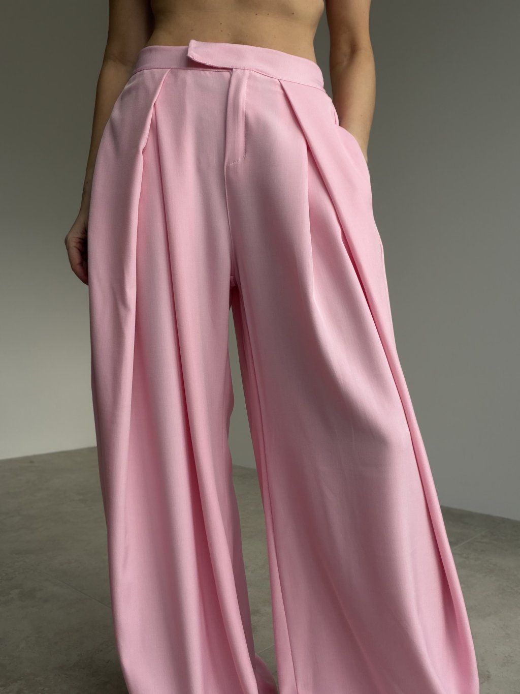 Široké nohavice s vysokým pásom, záhybmi vpredu a pružným pásom vzadu. Pohodlný, elegantný strih na každý deň aj do práce.