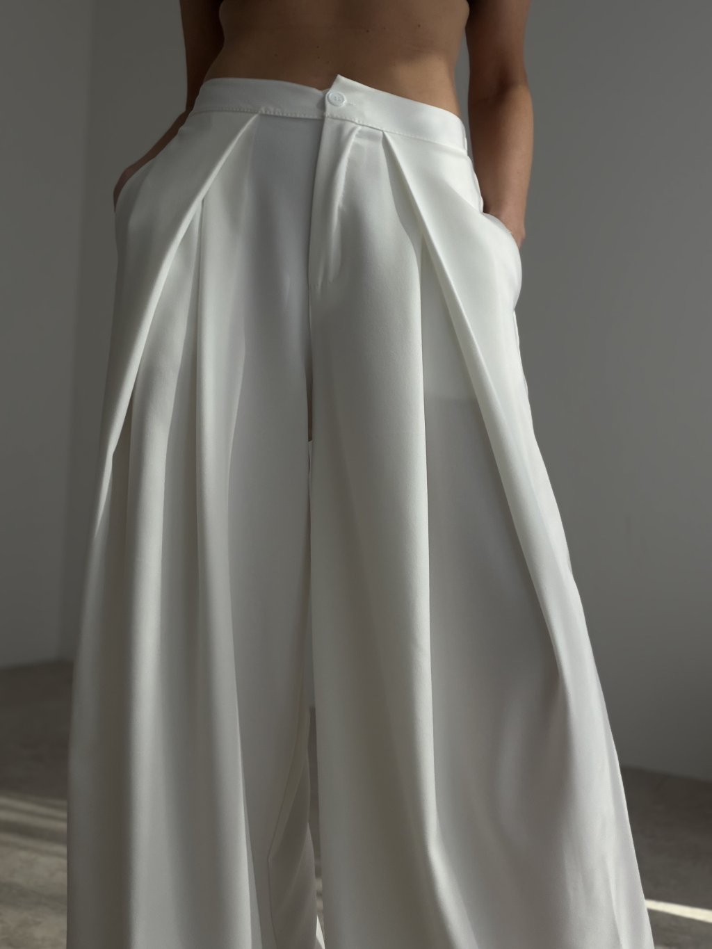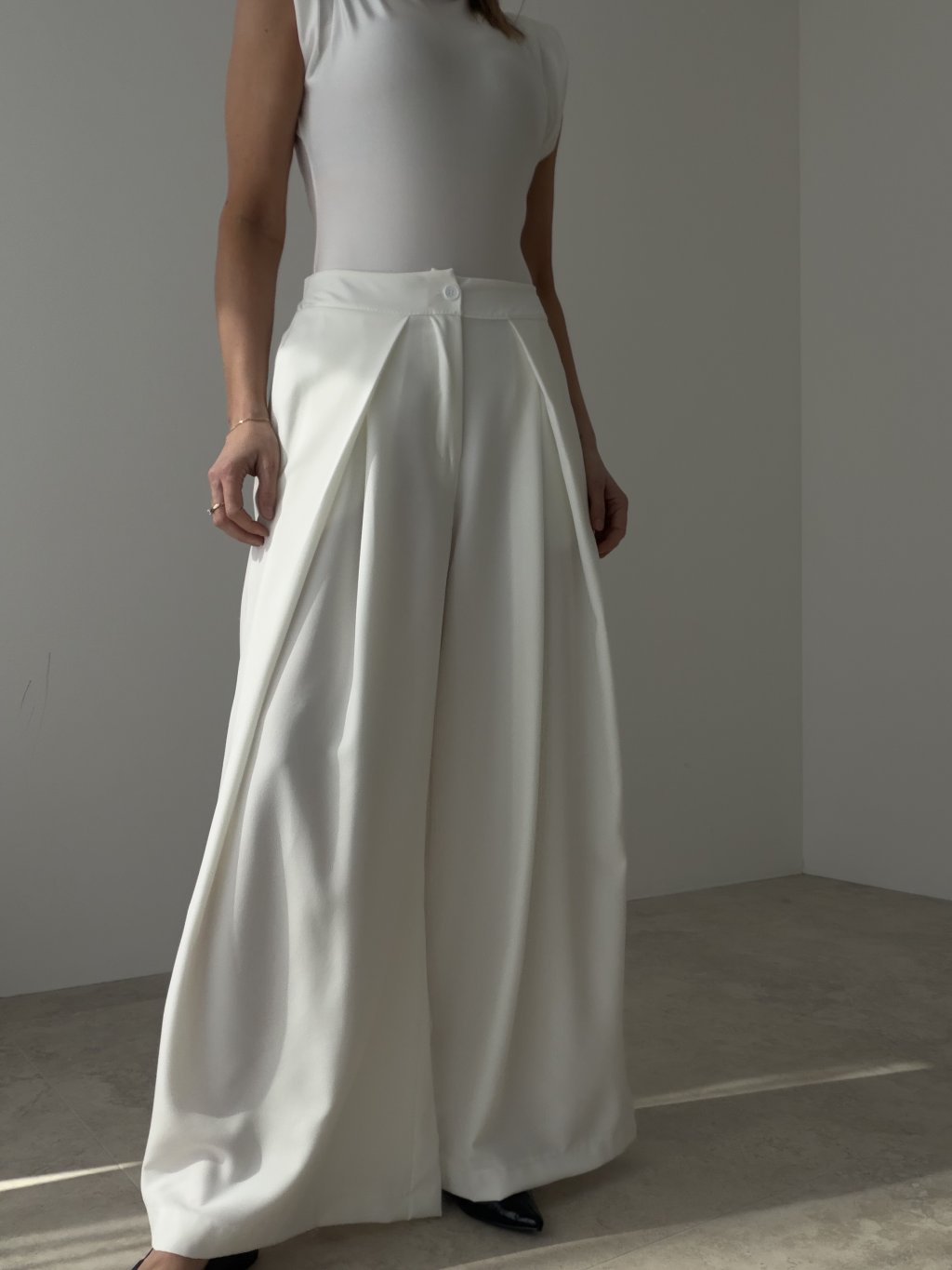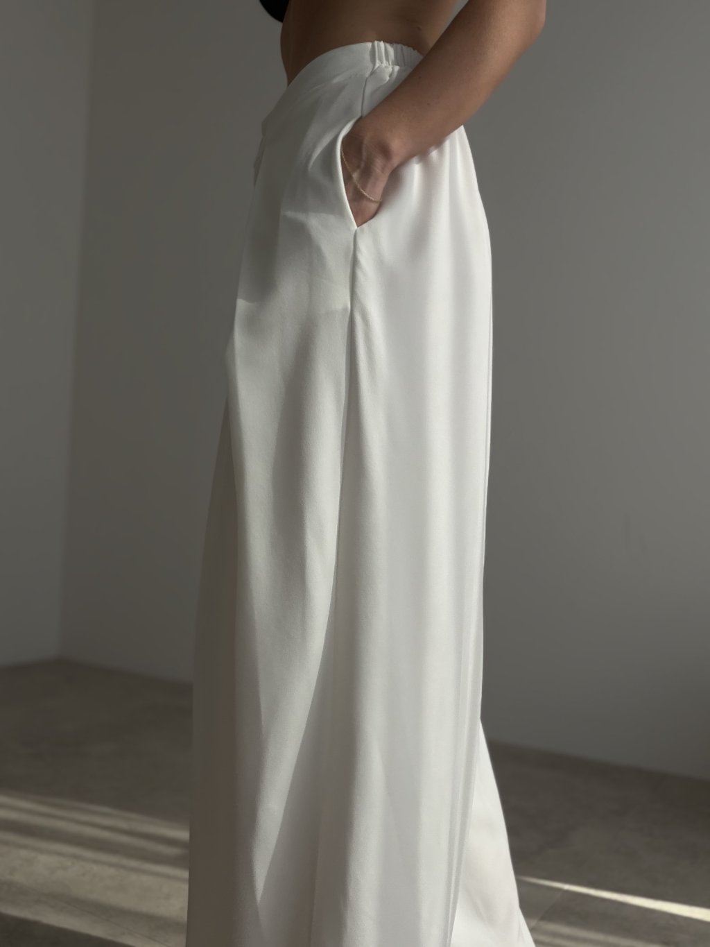 Wide nohavice sú výrazným a nadčasovým kúskom, ktorý dodá outfitu eleganciu, ženskosť a moderný charakter. Ich široký, splývavý strih pôsobí veľmi efektným dojmom, zároveň však zachováva pohodlie pri nosení. Vpredu pôsobia upravene a elegantne, zatiaľ čo zadná časť pásu je doplnená gumou, vďaka čomu sa nohavice lepšie prispôsobia postave a sú príjemné počas celého dňa. Tento model je ideálny na vytvorenie elegantných aj minimalistických outfitov a ľahko ho skombinuješ s body, topom, blúzkou či sakom.