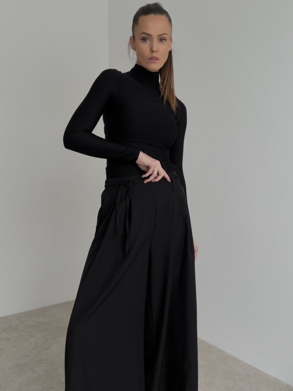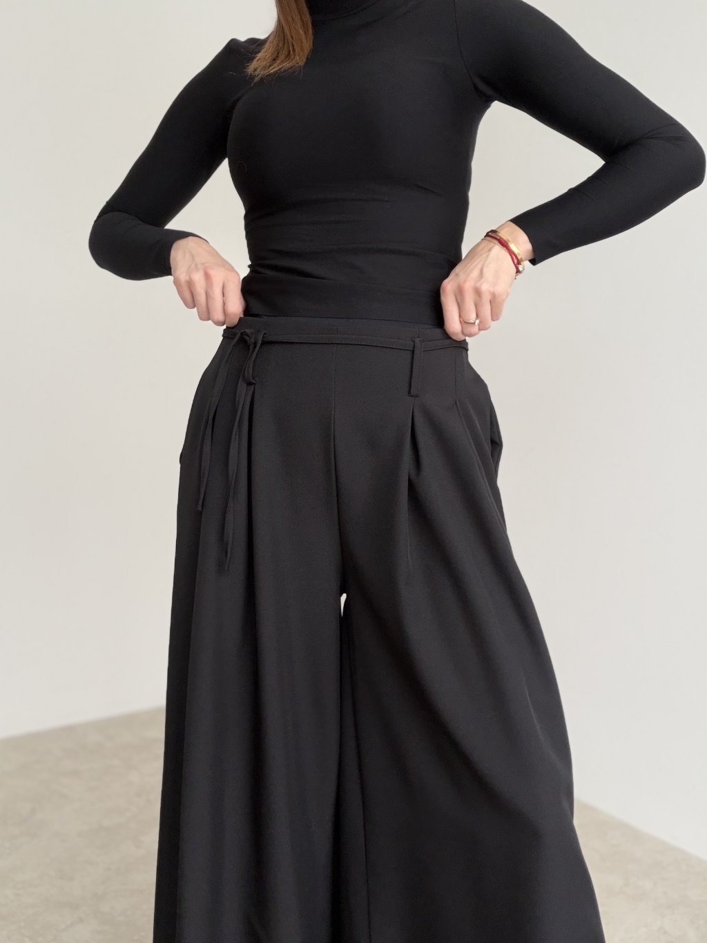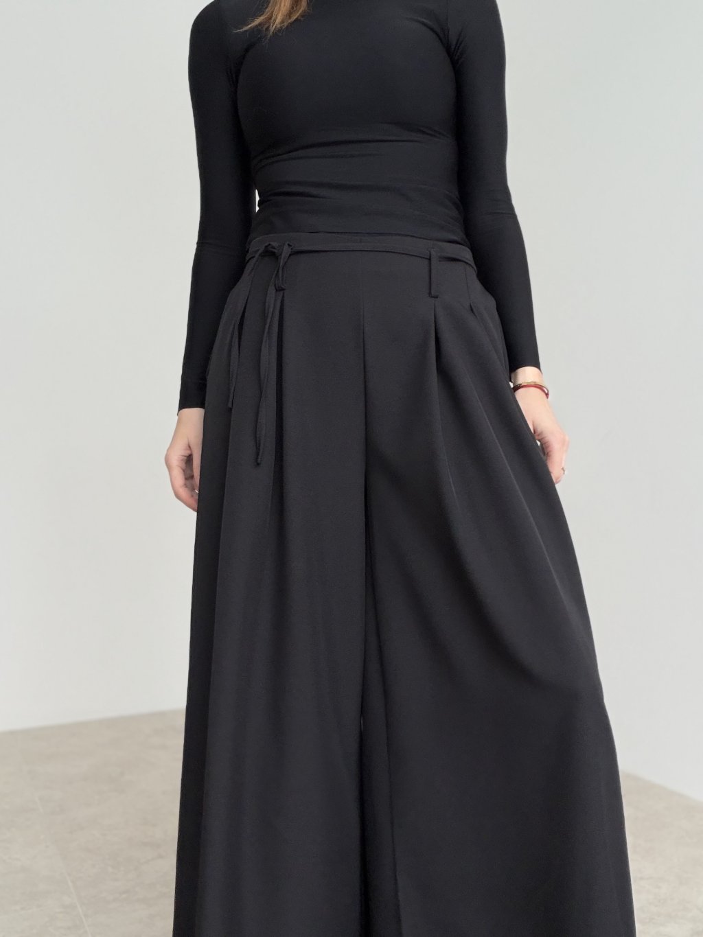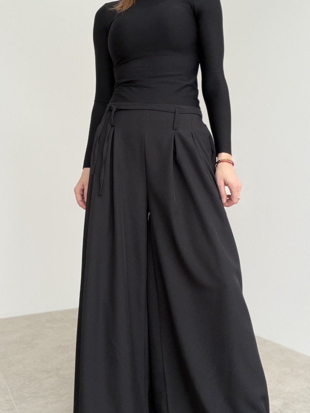 Široké nohavice s vyšším pásom, záševkami a viazaním v páse. Splývavý strih pôsobí elegantne a je pohodlný na každý deň aj do práce.