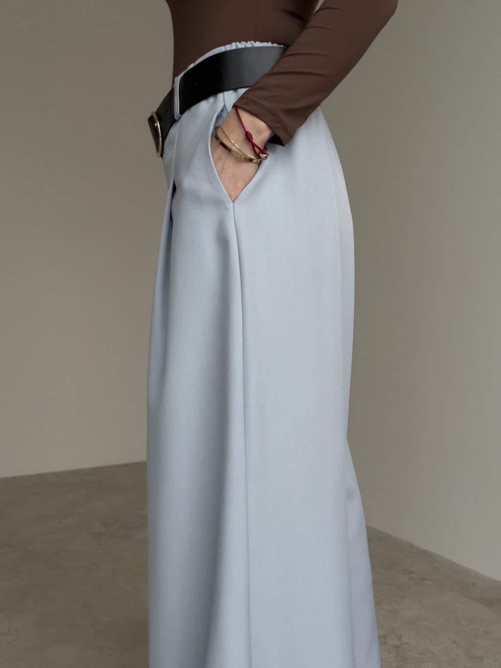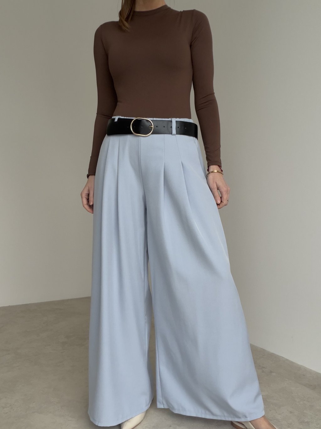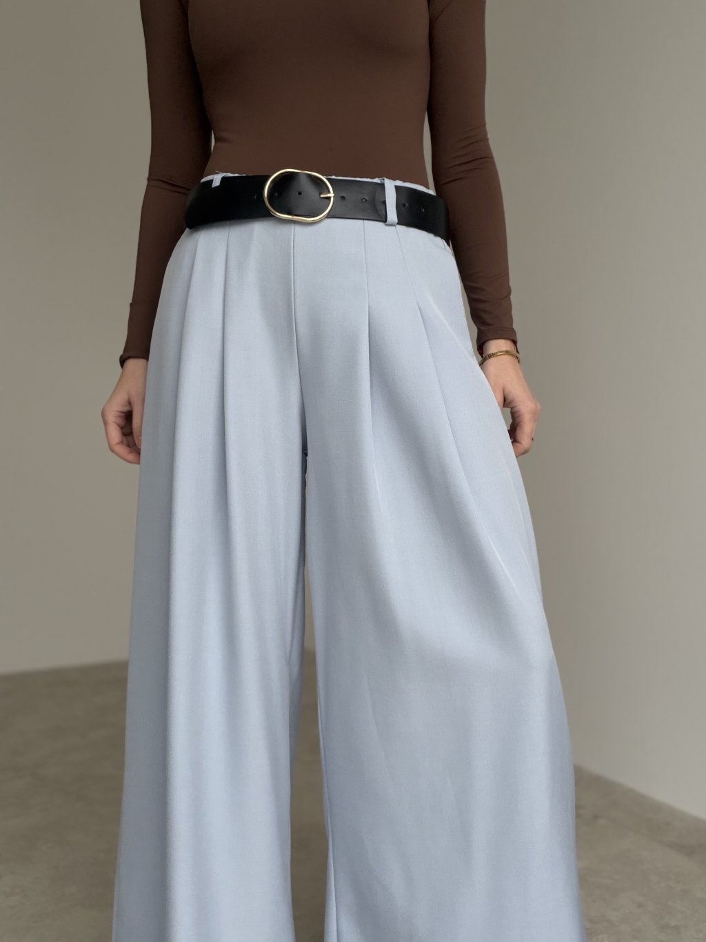 Široké nohavice s vyšším pásom, záhybmi vpredu a bočnými vreckami. Pohodlný, splývavý strih vhodný na každý deň aj do práce.