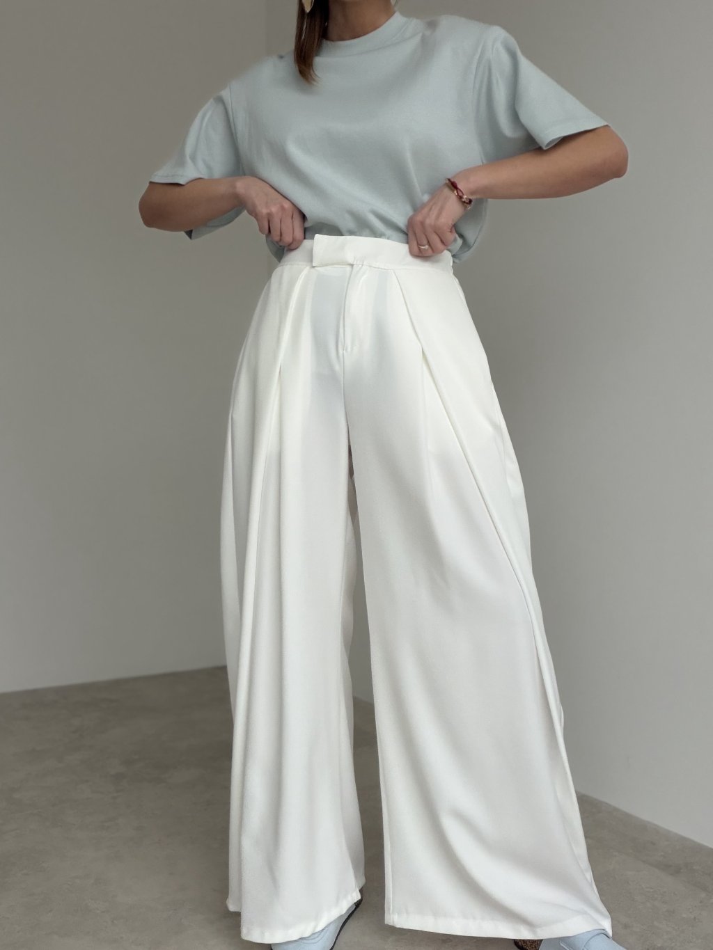 Elegantné široké nohavice s vysokým pásom, ktoré pôsobia upravene a zároveň sú maximálne pohodlné na celodenné nosenie. Predná časť so záhybmi vytvára krásnu siluetu a dodáva outfitu štruktúru, zatiaľ čo zadná časť pásu je riešená pružne, aby sa nohavice príjemne prispôsobili postave. Voľné, široké nohavice splývajú pri chôdzi, opticky predlžujú nohy a ľahko sa kombinujú do pracovných aj voľnočasových outfitov. Stačí zmeniť top a obuv a získaš úplne iný štýl – od minimalistického po elegantný.