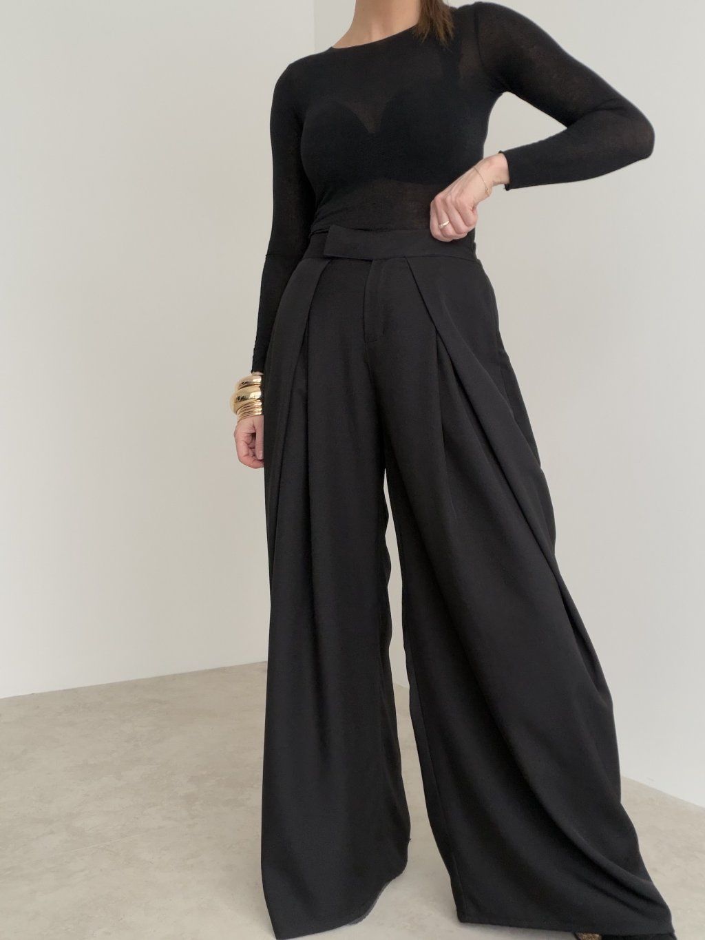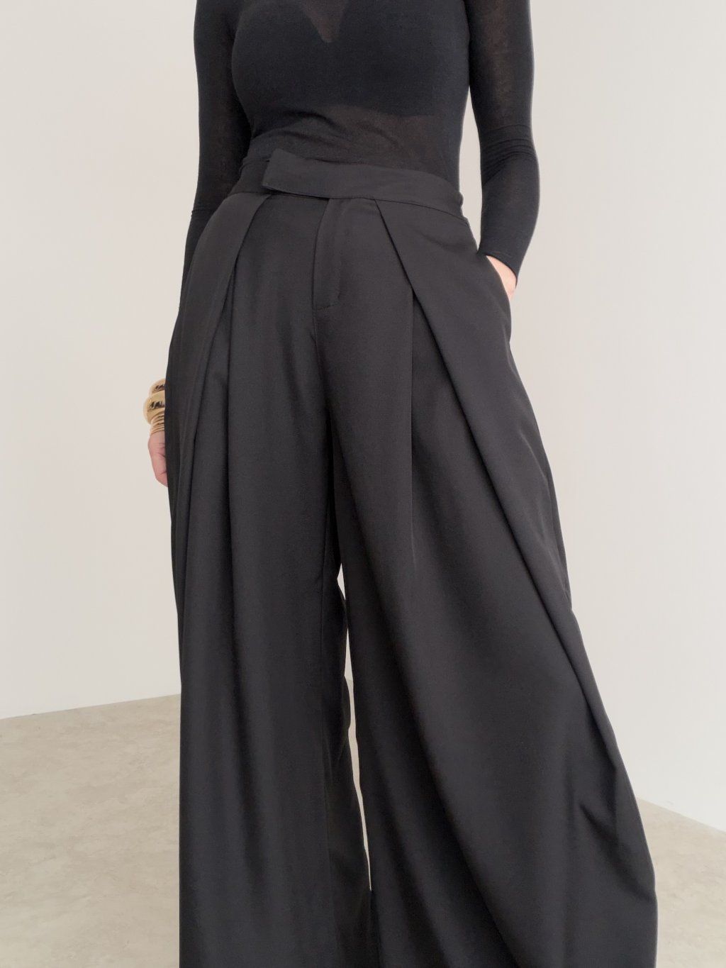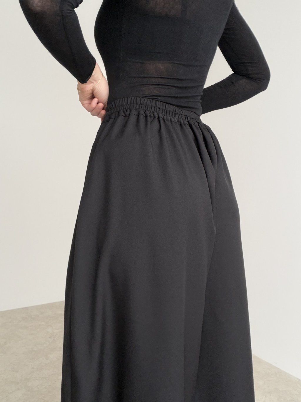 Elegantné široké nohavice s vysokým pásom, ktoré pôsobia upravene a zároveň sú maximálne pohodlné na celodenné nosenie. Predná časť so záhybmi vytvára krásnu siluetu a dodáva outfitu štruktúru, zatiaľ čo zadná časť pásu je riešená pružne, aby sa nohavice príjemne prispôsobili postave. Voľné, široké nohavice splývajú pri chôdzi, opticky predlžujú nohy a ľahko sa kombinujú do pracovných aj voľnočasových outfitov. Stačí zmeniť top a obuv a získaš úplne iný štýl – od minimalistického po elegantný.